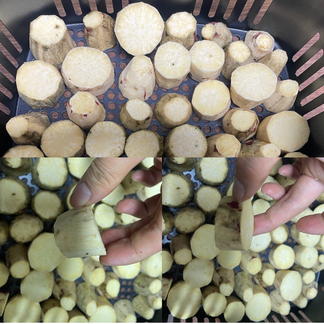 너무 촘촘하지 않게 에어프라이어에 넣어줍니다. 여기에 오일을 발라주시는 분들도 계시는데 저는 아이들이 기름을 덜 먹었으면 좋을거같아서 오일을 사용하지않고 정말 고구마 100%로 진행을 했습니다. 요즘 한참 논란이 일고있는 종이호일은 과감하게 생략했습니다. 어차피 기름을 쓰지않아 묻어나오는 것도 거의 없습니다. 설거지가 굉장히 편합니다.